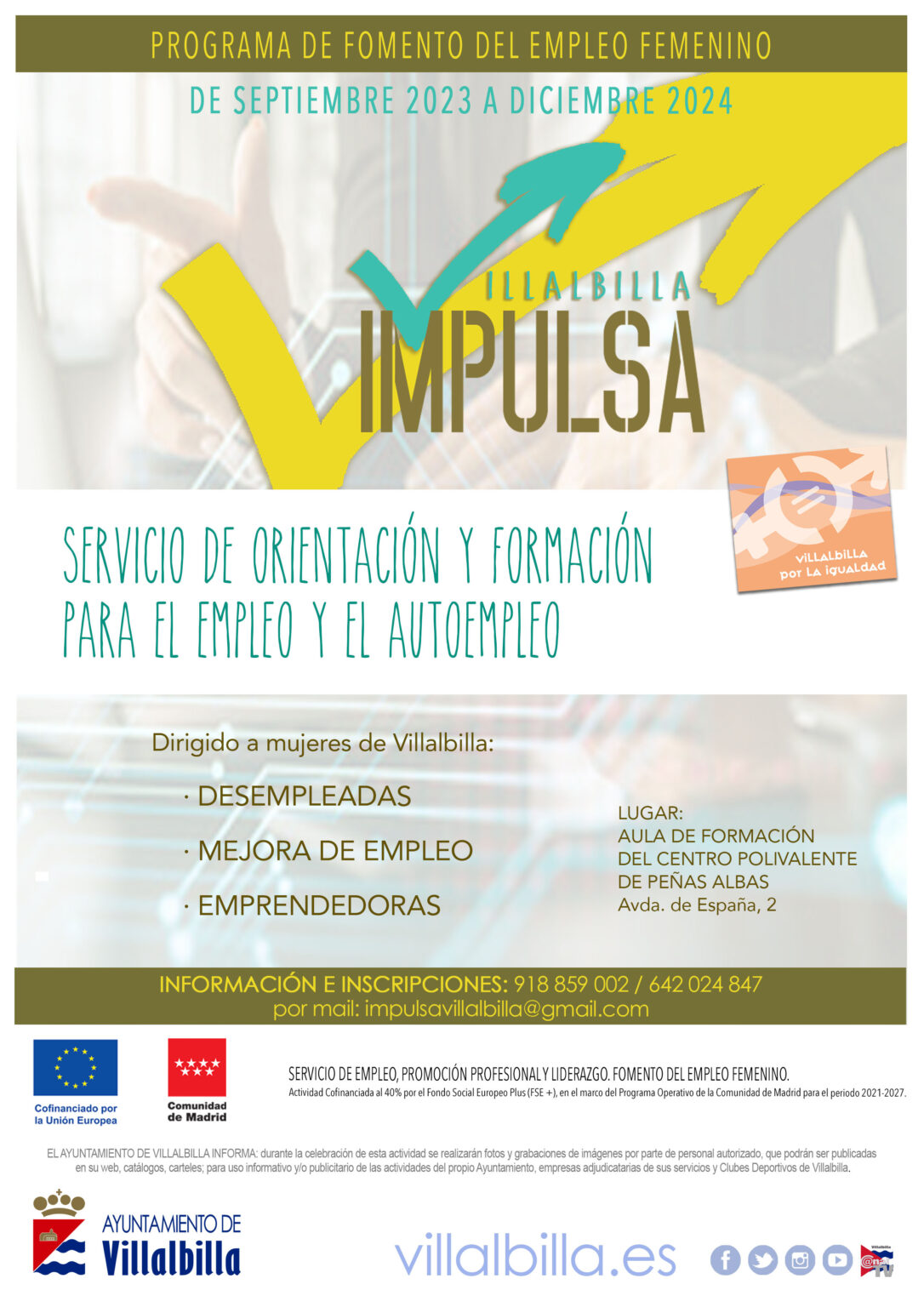 El Programa Villalbilla Impulsa te brinda un servicio de orientación para el empleo y el autoempleo, la formación profesional y el emprendimiento. Abierto a mujeres desempleadas, en situación de mejora de empleo, emprendedoras y empresarias.  Este  proyecto, “VILLALBILLA IMPULSA”, está cofinanciado por la Comunidad de Madrid y el Fondo Social Europeo.