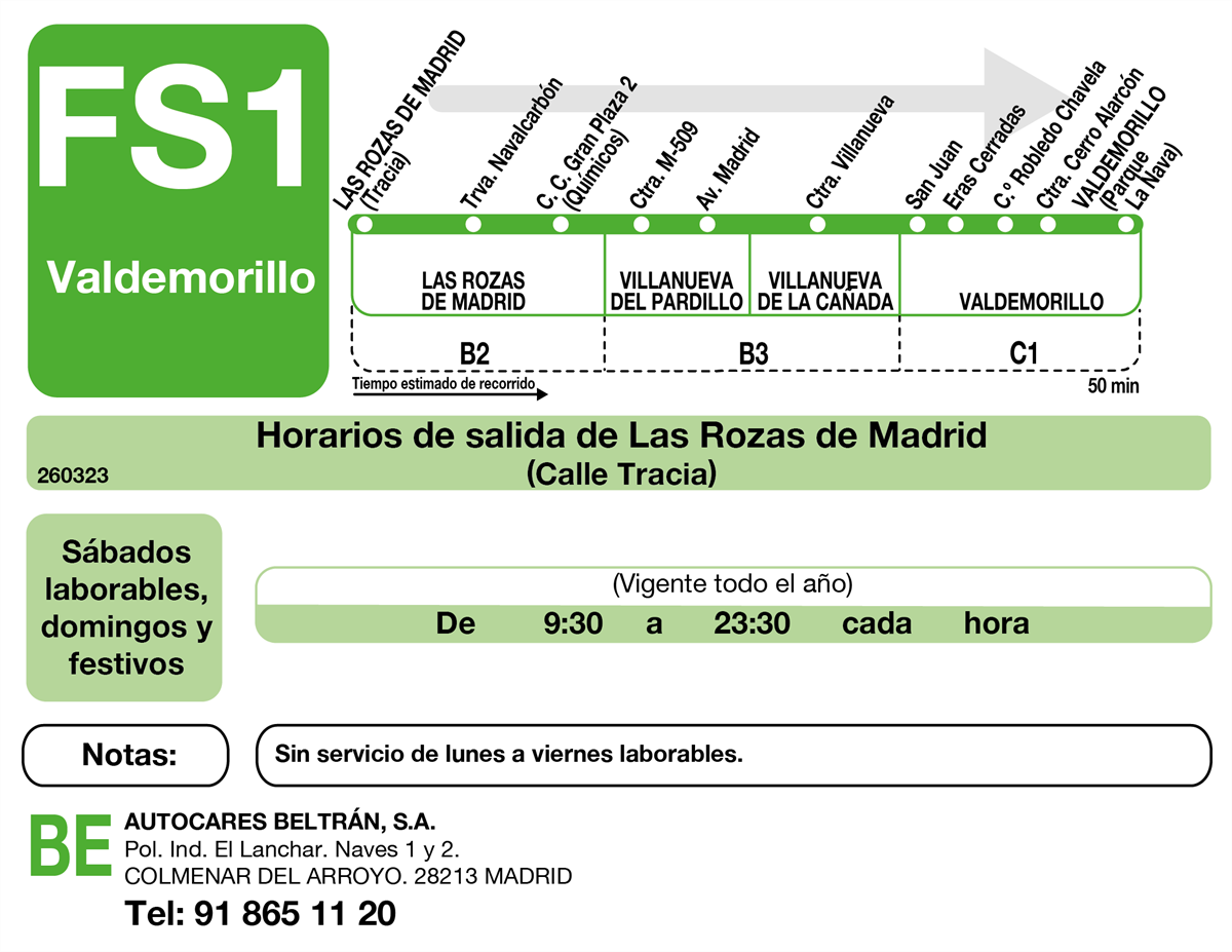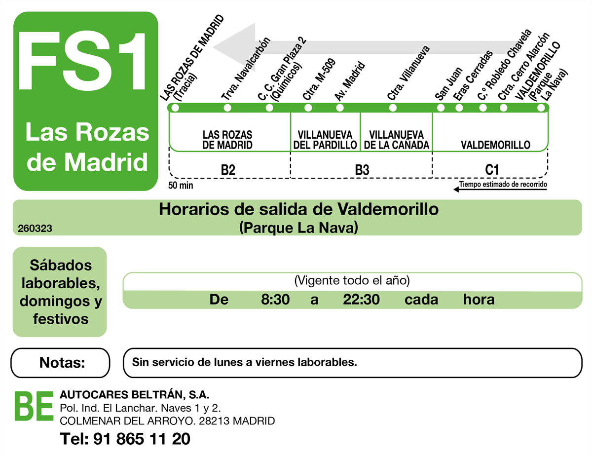 Por su parte, el Consorcio Regional de Transportes atiende, con esta propuesta, al planteamiento del Ejecutivo local de Valdemorillo y pone en marcha esta nueva línea interurbana. Con cabecera en dicho municipio, contando con 15 expediciones de ida y 15 de vuelta todos los sábados, domingos y festivos, la L-FS1 efectúa parada en Villanueva la Cañada, Centro Comercial ‘Gran Plaza Norte 2’ en Majadahonda y ‘Heron City/Las Rozas Village’.
