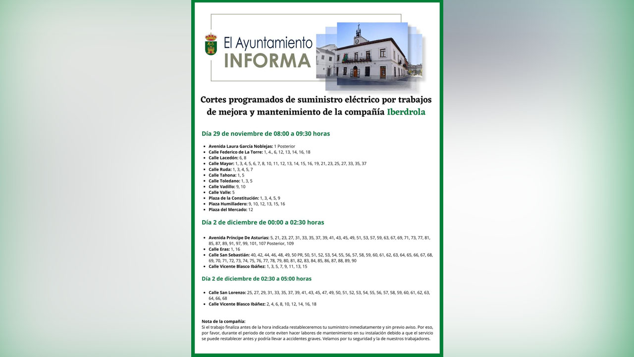 El Ayuntamiento de Villaviciosa de Odón ha anunciado a través de la Web municipal que durante la madrugada del próximo jueves día 2 de diciembre la compañía eléctrica Iberdrola realizará obras de mejora de sus instalaciones en diversas calles del municipio y que, debido a dichos trabajos, será necesario interrumpir el suministro eléctrico en varias calles durante dos tramos horarios diferenciados. El primer tramo irá desde las 12 de la medianoche hasta las 2:30 horas de ese día, y afectará a la Avenida príncipe de Asturias (Números 5, los impares del 21 al 91 - Excepto 25, 29, 47, 55, 61, 65, 75, 79, 83 -, y los números 97, 99, 101, 107 Posterior y 109), la Calle Eras (Números 1 y 16), la Calle San Sebastián (Números pares del 40 al 48 y todos los números del 49 al 90, incluyendo también el 50 PR) y la Calle Vicente Blasco Ibáñez (Números impares del 1 al 15).