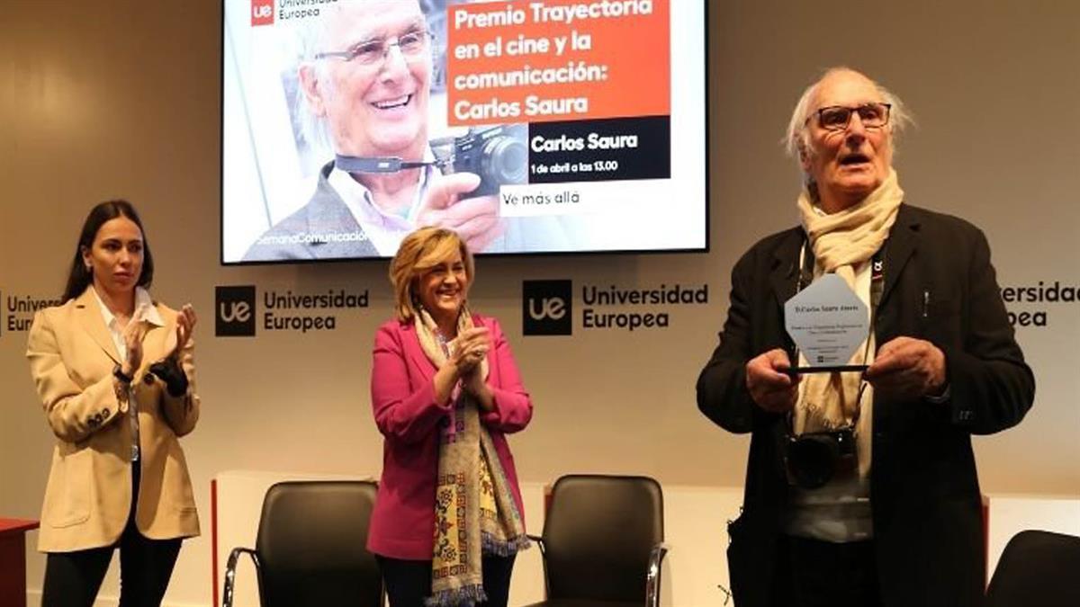 La Universidad Europea ha otorgado el “Premio a la Trayectoria en Comunicación” al cineasta, fotógrafo y escritor español Carlos Saura (Huesca, 1932), por su “brillante recorrido profesional”, en un acto que se ha llevado a cabo en el campus de Villaviciosa de Odón (Madrid). La entrega de este reconocimiento ha tenido lugar en la clausura de la XXVIII edición de la Semana de la Comunicación y el Marketing, un evento de referencia en el sector organizado por la Facultad de Ciencias Sociales y de la Comunicación, y que entre el 28 de marzo y el 1 de abril ha contado con la presencia de destacados profesionales de diversos ámbitos del Periodismo, la Publicidad, el Marketing, la Comunicación Audiovisual y las Relaciones Internacionales.