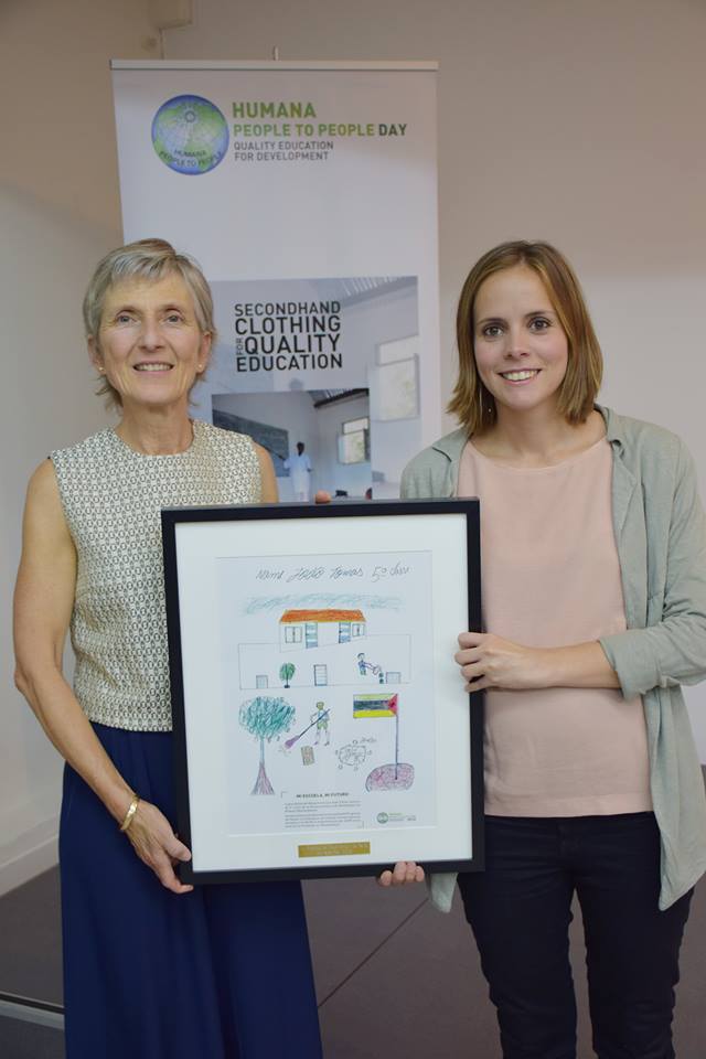 El premio es un dibujo hecho por un alumno de la Escuela Primaria de Motepuez (Bilibiza, Mozambique). Niños y niñas tenían que reflejar los elementos que consideran fundamentales para su educación, con especial atención a la figura del maestro. La escuela y los profesores forman parte del Programa de Apoyo a la Educación de Calidad cofinanciado por Humana y la Agencia Española de Cooperación Internacional para el Desarrollo (AECID), e implementado por ADPP, socio local de la Fundación en Mozambique.