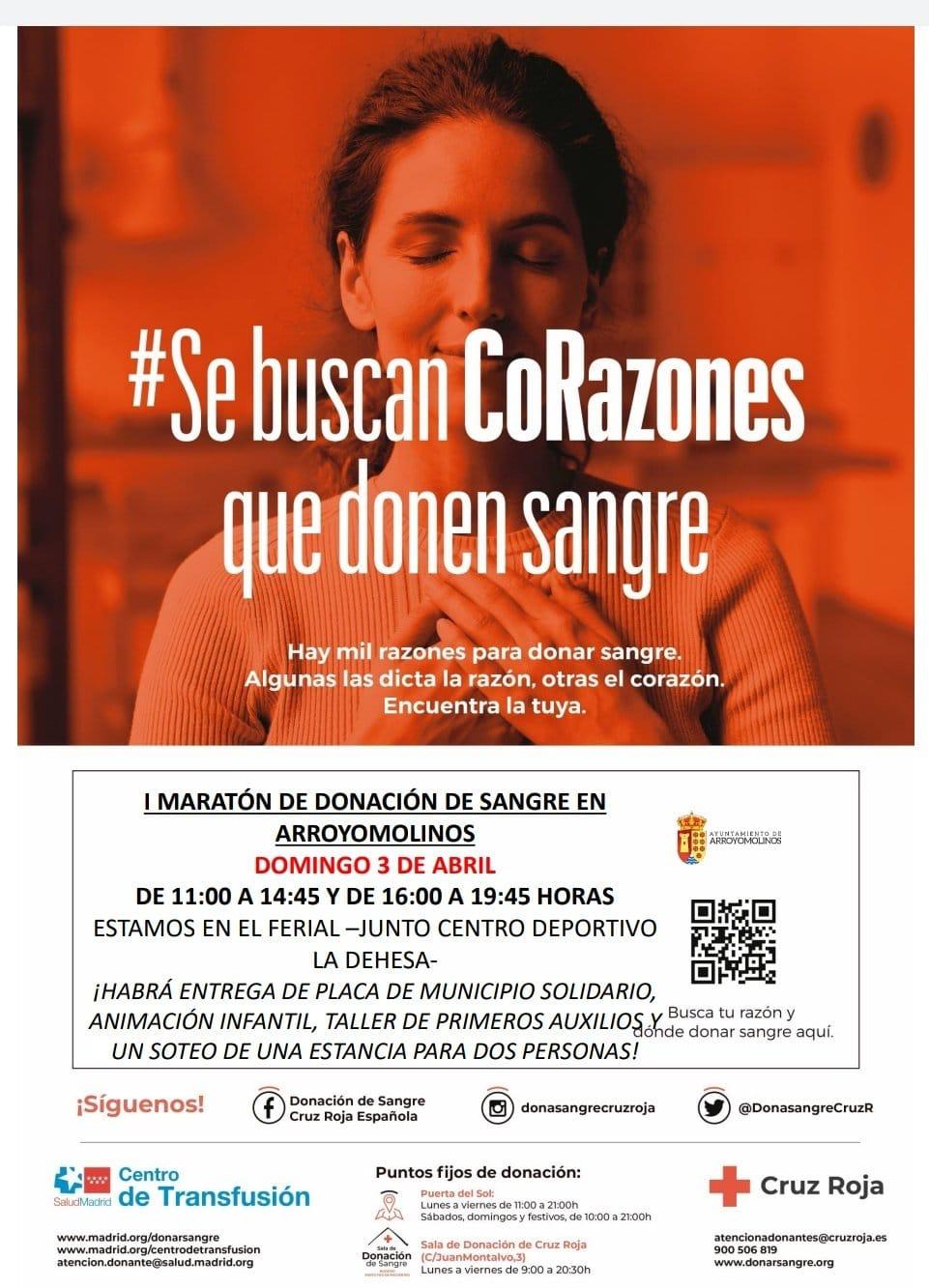 Arroyomolinos se suma a la ayuda de donación de sangre con la I maratón de Donación de Sangre Arroyomolinos. Se celebrará el domingo día 3, desde las 11.00 horas a las 14.45 horas y desde las 16.00 horas a las 19.45 horas.