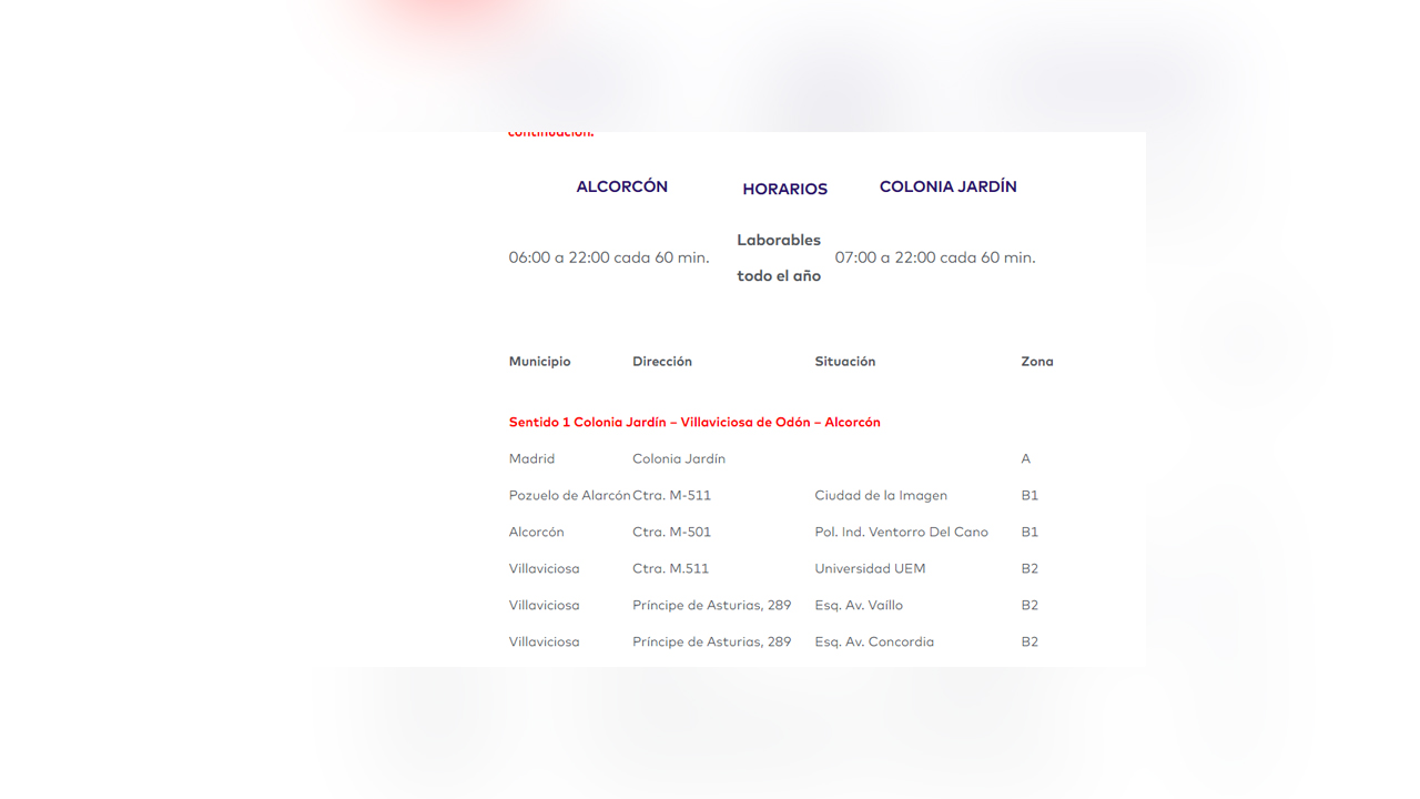 A partir de ese día, la Línea 510-A, que hasta ahora hacía el trayecto entre Alcorcón Central y la Urbanización el Bosque de Villaviciosa de Odón de manera directa, pasará a realizar el trayecto entre Alcorcón Central y la estación madrileña de Metro de Colonia Jardín.