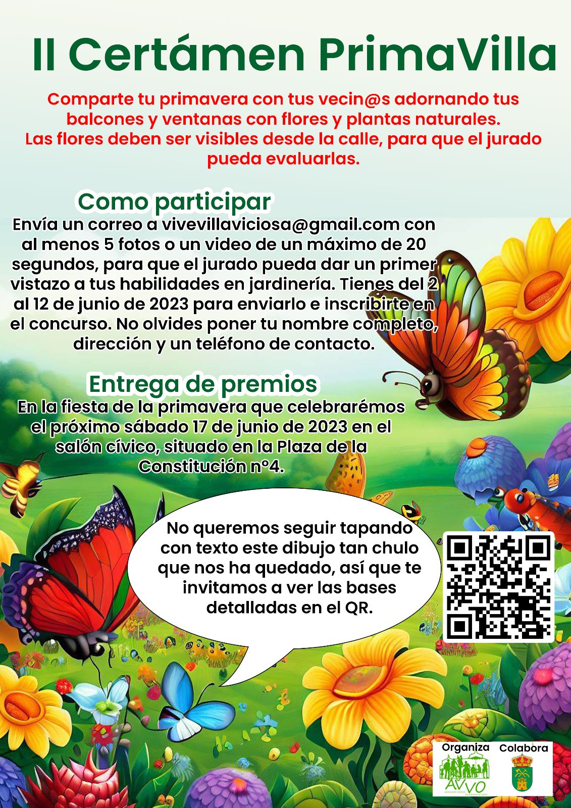 La Asociación de Vecinos de Villaviciosa de Odón, como segundo año consecutivo, dada la aceptación del pasado año y dentro de la Fiesta de Primavera, invita a los vecinos y vecinas de la localidad que exterioricen la llegada de la primavera a su entorno familiar, para lo cual ha convocado el “II CONCURSO PRIMAVILLA“ consistente en adornar con flores y plantas naturales sus balcones, ventanas y terrazas.