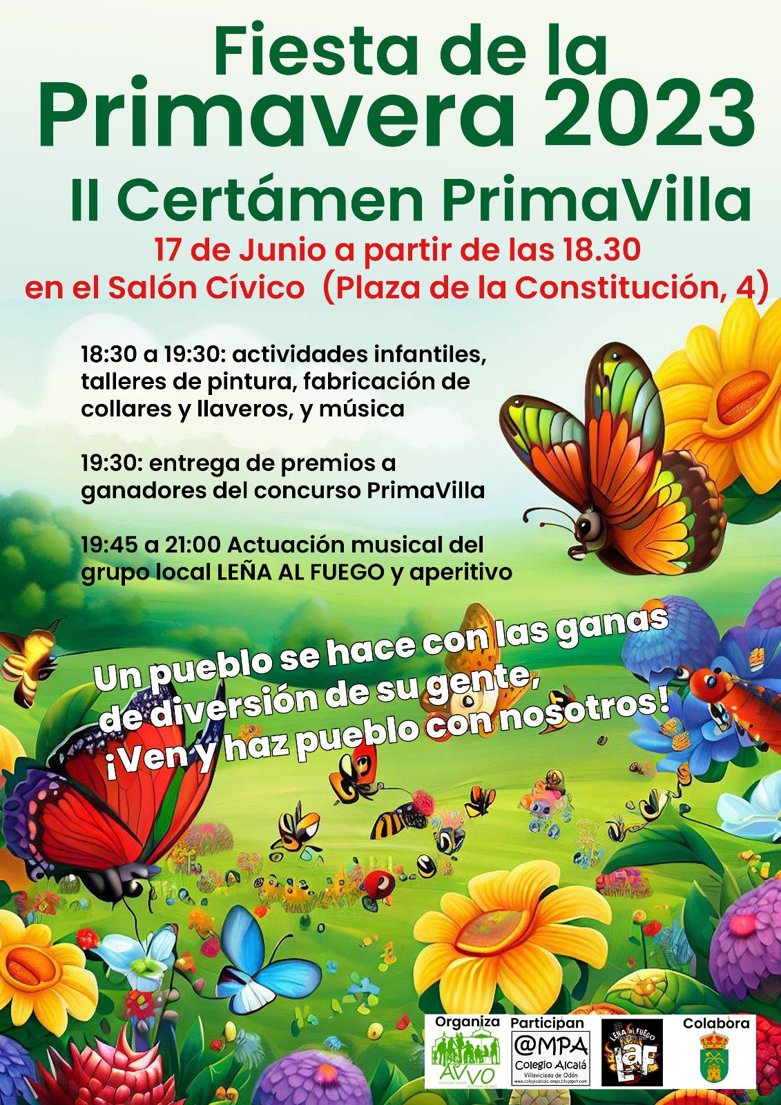 El evento contará con una primera parte de actividades infantiles en las que todos los niños y niñas asistentes podrán pintar, fabricar pulseras y collares, pintarse la cara y bailar Posteriormente àra los más mayores, habrá la actuación del grupo de rock local “LEÑA AL FUEGO” quien nos acompañara hasta finalizar la fiesta sobre las 22,00 horas. También tendremos un pequeño refrigerio que compartiremos entre todos los vecinos y vecinas que nos acompañen.