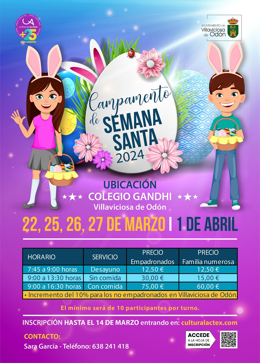 El Ayuntamiento de Villaviciosa de Odón, junto a la Concejalía de Educación, ha organizado los campamentos para la Semana Santa. Los días de campamento serán el 22, 25, 26 y 27 de marzo y el 1 de abril, en el Colegio Gandhi.