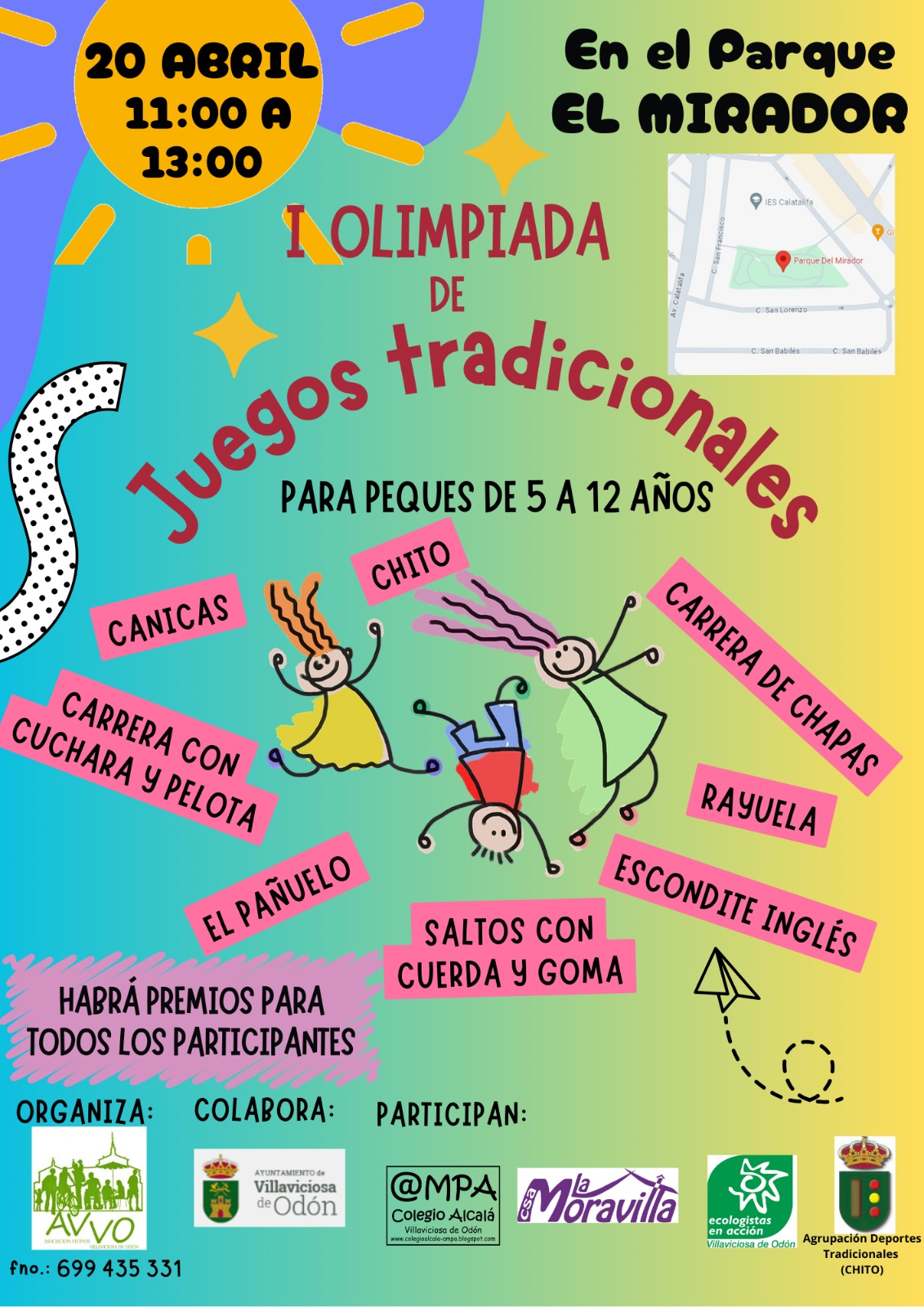 La “Olimpiada de Juegos Tradicionales” se celebrarán el sábado día 20 de abril a partir de las 11:00 hasta las 13:00 horas, en el Parque El Mirador de Villaviciosa de Odón ubicado entre las Calles San Lorenzo, San Francisco y San Lorenzo en la parte trasera del Instituto de Calatalifa, dentro de la Urbanización El Mirador.