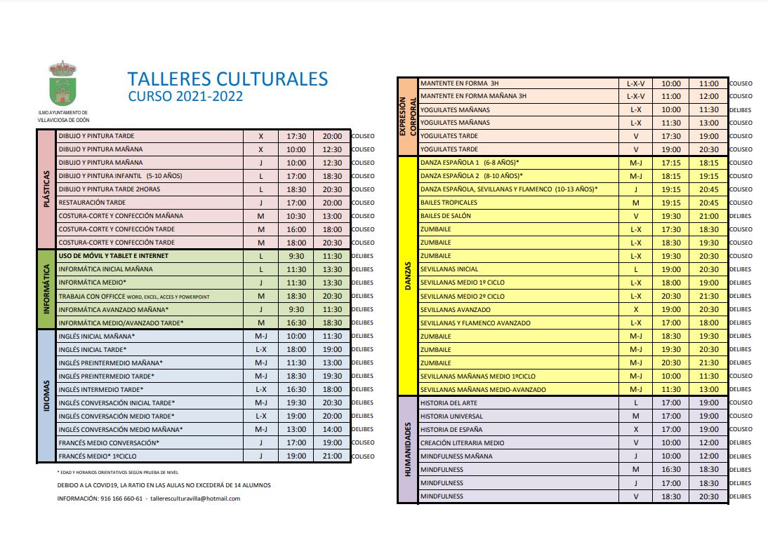 Este lunes día 13 de septiembre comienzan las inscripciones para apuntarse a los talleres Municipales de Cultura de nuestra localidad, relativos al año académico 2021/2022. Está previsto que comiencen el 1 de octubre bajo todas las medidas sanitarias para la prevención del COVID-19.
