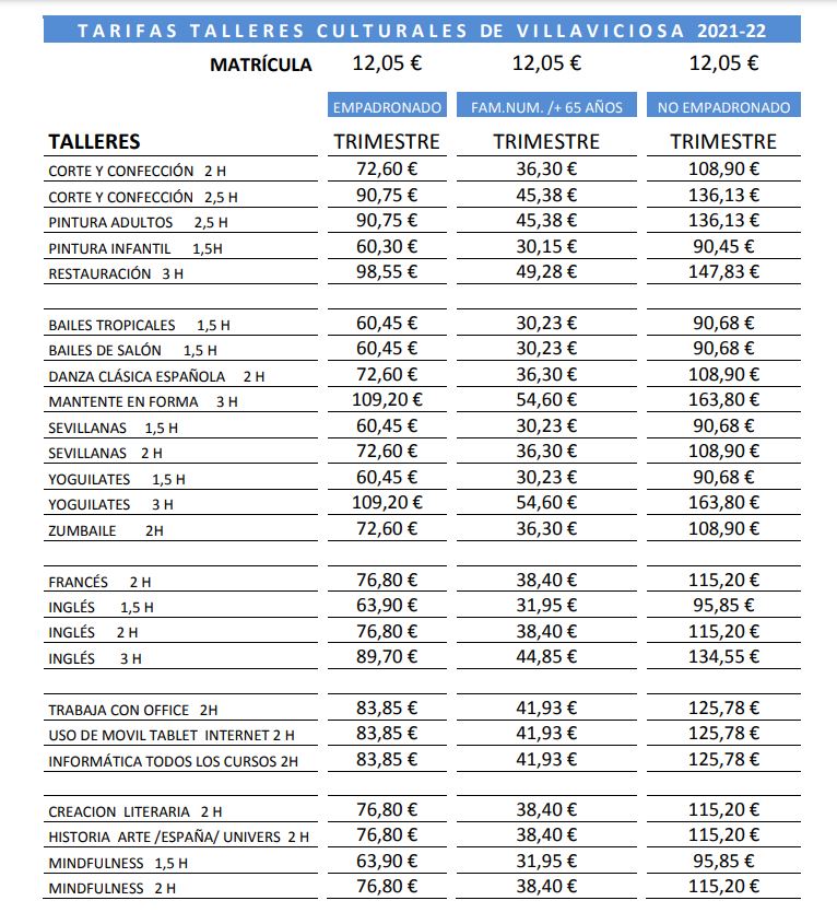 Los mayores de 65 años e integrantes de familia numerosa cuentan con un 50% de descuento en la tarifa, y en caso de discapacidad a partir de un 33% hay exención de pago de uno de los talleres. Ambas condiciones deberán acreditarse mediante la documentación correspondiente.