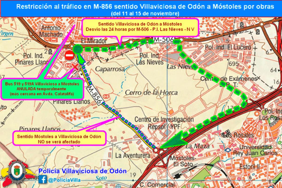 Se verá afectado, así, el sentido de salida de Villaviciosa de Odón, lo que conllevará a los conductores a tener que tomar un desvío alternativo. Como opción, pueden dirigirse por la carretera M-506 para proseguir por el Polígono Industrial de Las Nieves, hasta llegar a la Nacional V. La duración estimada del trayecto puede ser de unos 7 minutos.
