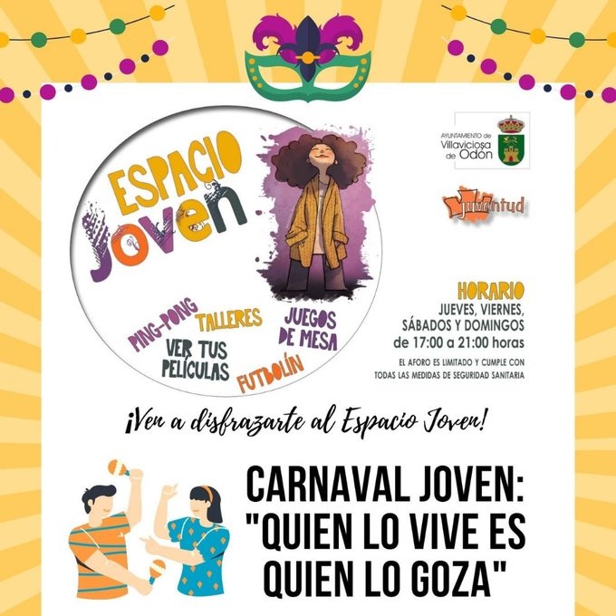 Por otra parte, se contempla la realización de diferentes talleres de manualidades, juegos de mesa y otras actividades gratuitas, -para las que no es necesaria inscripción previa- en el Espacio joven (Centro Miguel Delibes), durante los días 25 y 26 de febrero, en horario de 17 a 21 horas, bajo el lema 'Carnaval Joven: Quien lo vive es quien lo goza'. El aforo es limitado y se cumple con todas las medidas de seguridad sanitaria.
