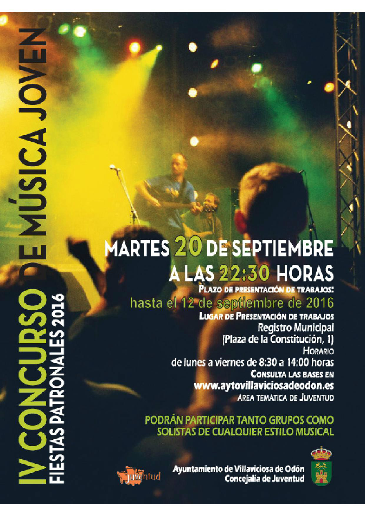 La concejalía de Juventud de Villaviciosa de Odón da la oportunidad a todos aquellos que tengan un grupo de música o que sean solistas de demostrarlo. En honor a las Fiestas Patronales de este año, Villaviciosa ha querido organizar el IV Concurso de Música Joven de las Fiestas Patronales 2016, para todos aquellos que quieran pasar un buen rato y quién sabe si ganar algún que otro premio.