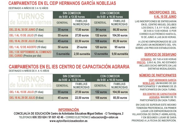 Precios de los campamentos urbanos que se van a desarrollar en el CEIP Hermanos García Noblejas y en el ÍES Centro de Capacitación Agraria.